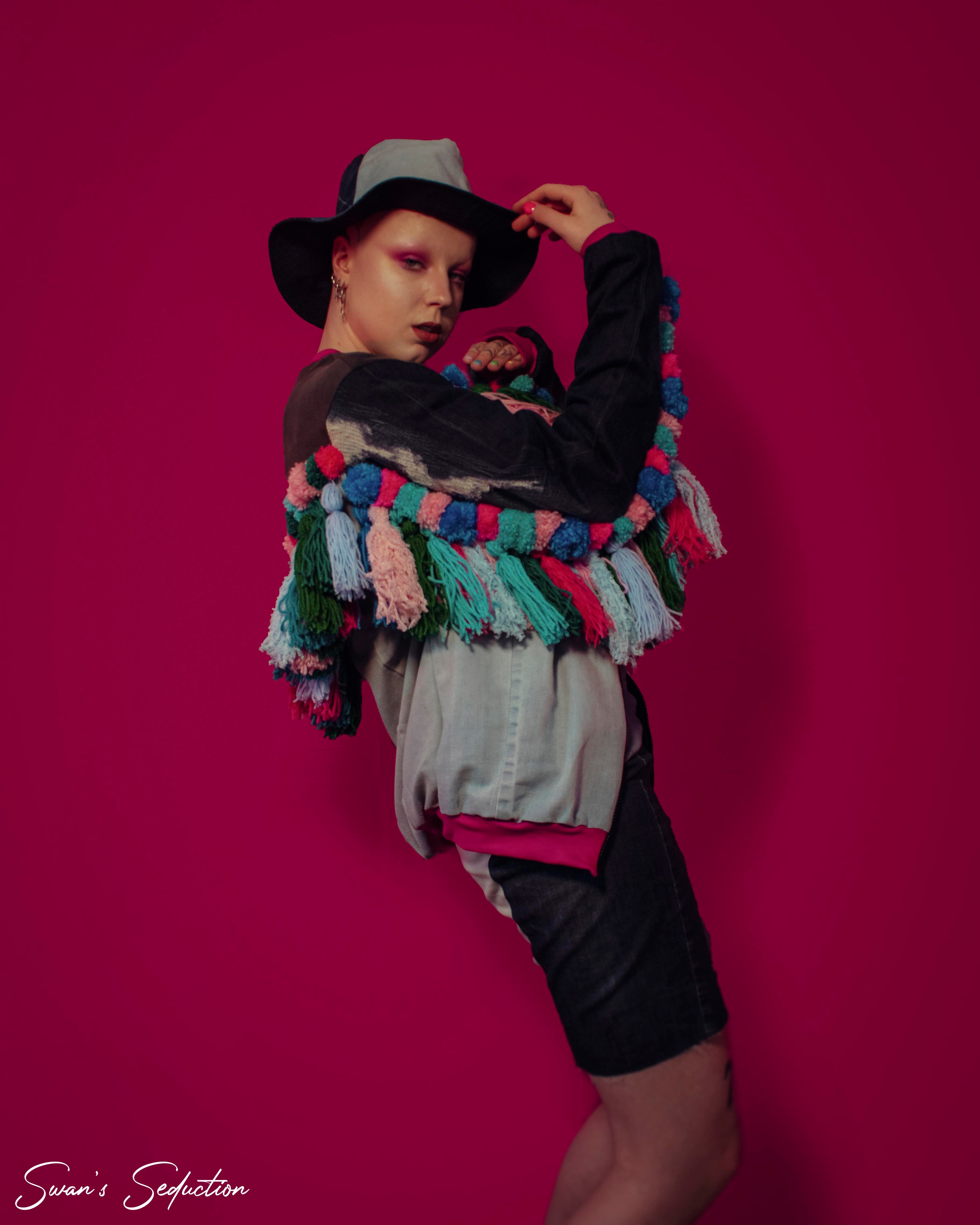 Bomberstyle jacket made from upcycled denim with a lining made from deadstock purple satin and tassels and pompoms made from wool scraps.