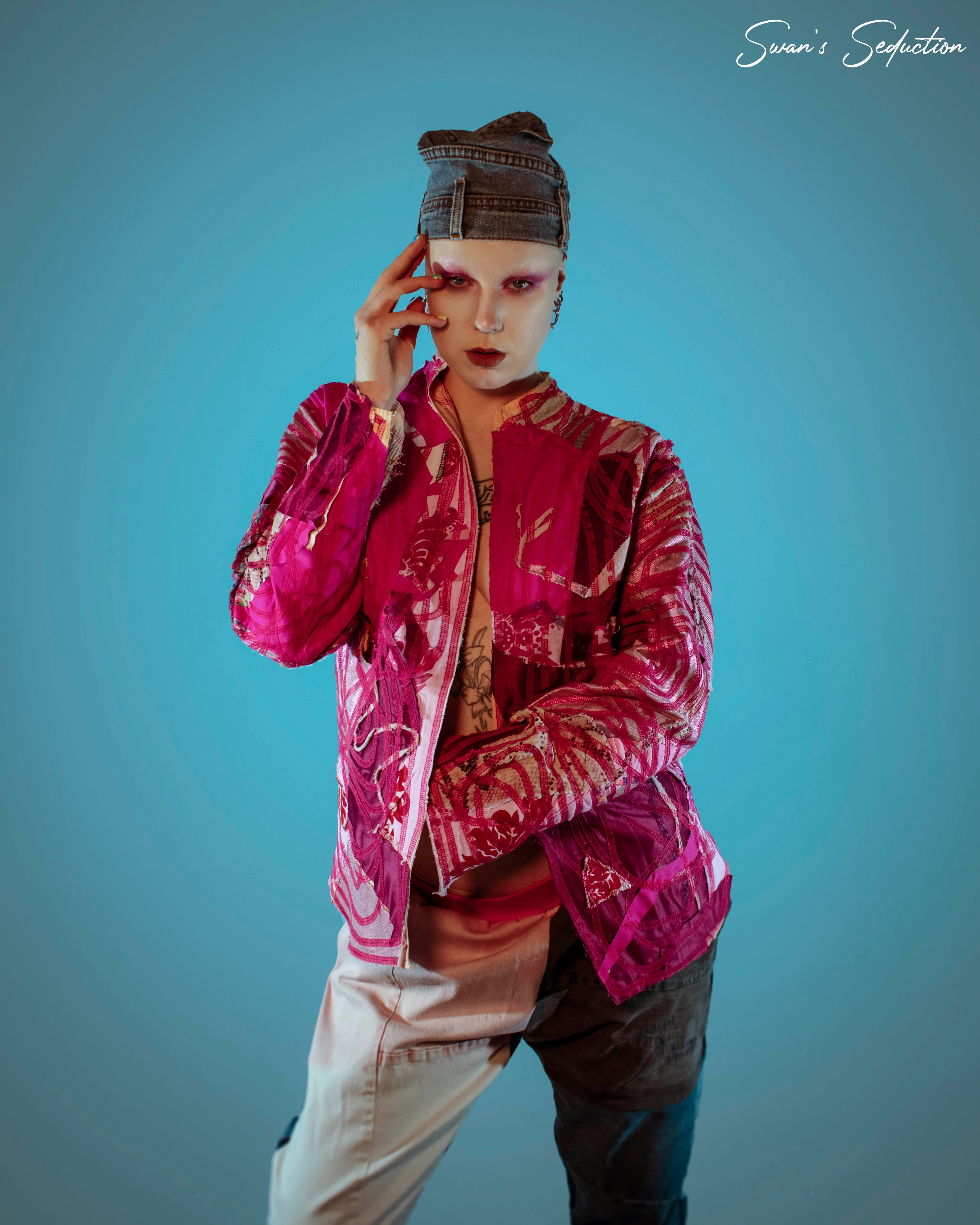Jacket made from upcycled pink fabric scraps on a cotton base.