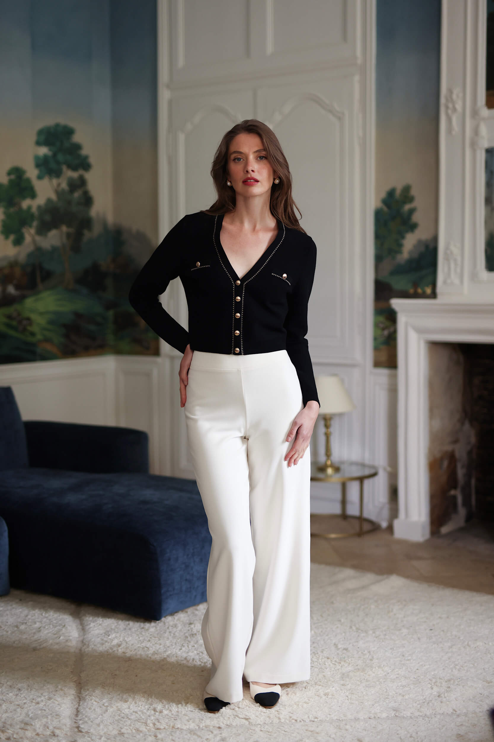These pants are crafted from luxurious upcycled fabric with a soft viscose lining and feature a high waist. The straight-leg design allows for ease of movement, while a side zipper provides easy access.