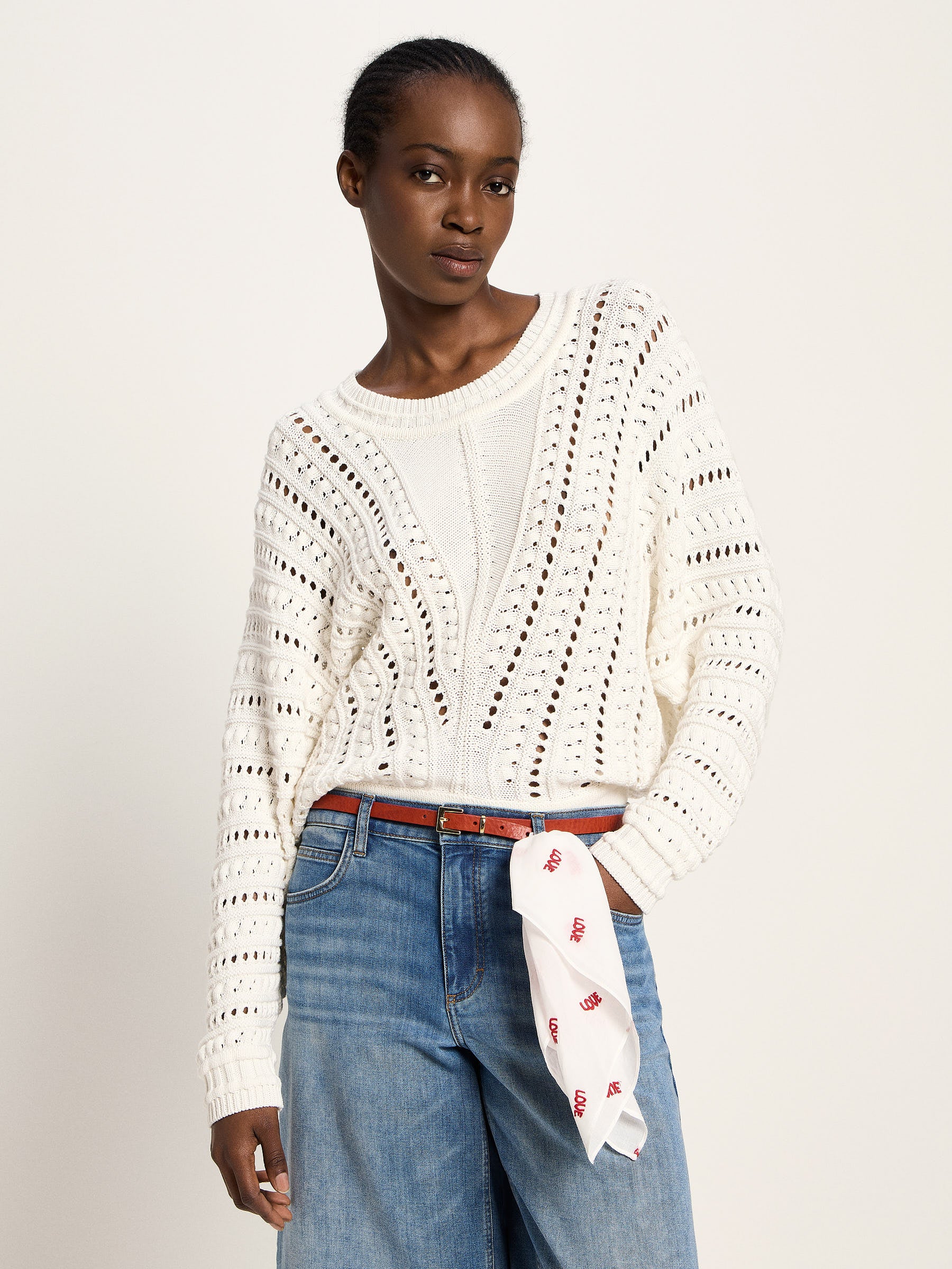 Airy knit with attention to detail: This openwork sweater made of pure organic cotton impresses with its feminine knit pattern, pleasantly soft feel, and natural lightness. The openwork pattern adds structure and subtle transparency. Vegan-friendly and GOTS-certified, it's perfect for transitional wear or as a layering piece over a top or dress.