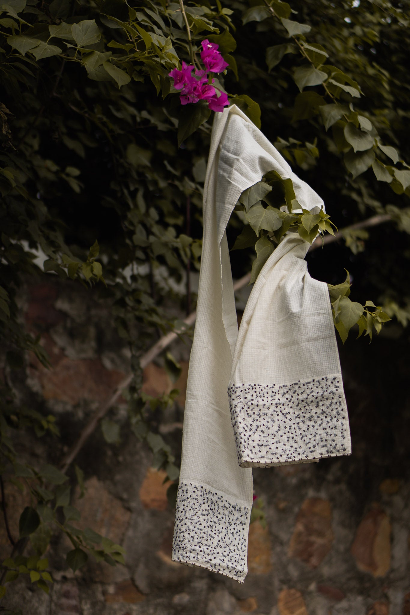 Crafted in 100% organic cotton fibres and natural materials. This sheer self-checked scarf is undyed and unbleached. The textural beauty of the fabric renders itself in enhancing the beauty of hand-embroidery.