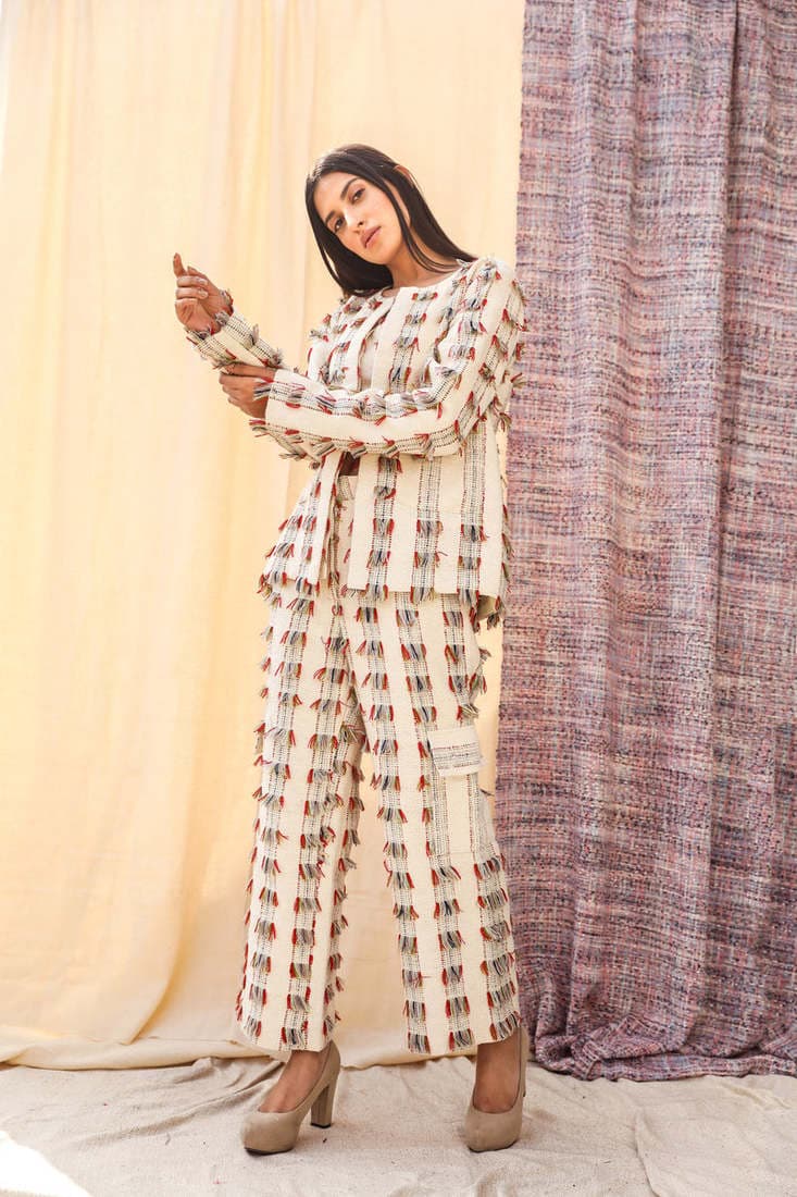Our fabrics are handwoven in different parts of Punjab. The weavers and artisans have looms in their homes, their families are skilled inbred when it comes to weaving. Their usual weaving taste is more biased towards home furnishing, however, we provide these wonderful craftsmen with our colour palettes and the outcome is just exquisite. We also make sure to have a look at what was previously produced by them and is kept as waste, and try to incorporate them in our line up.